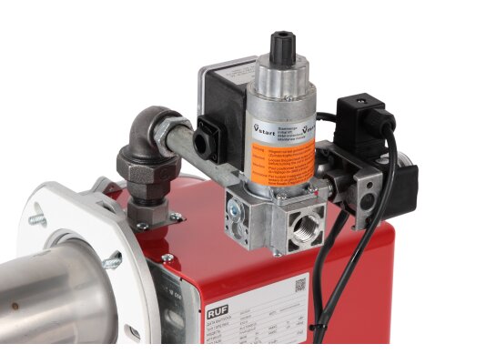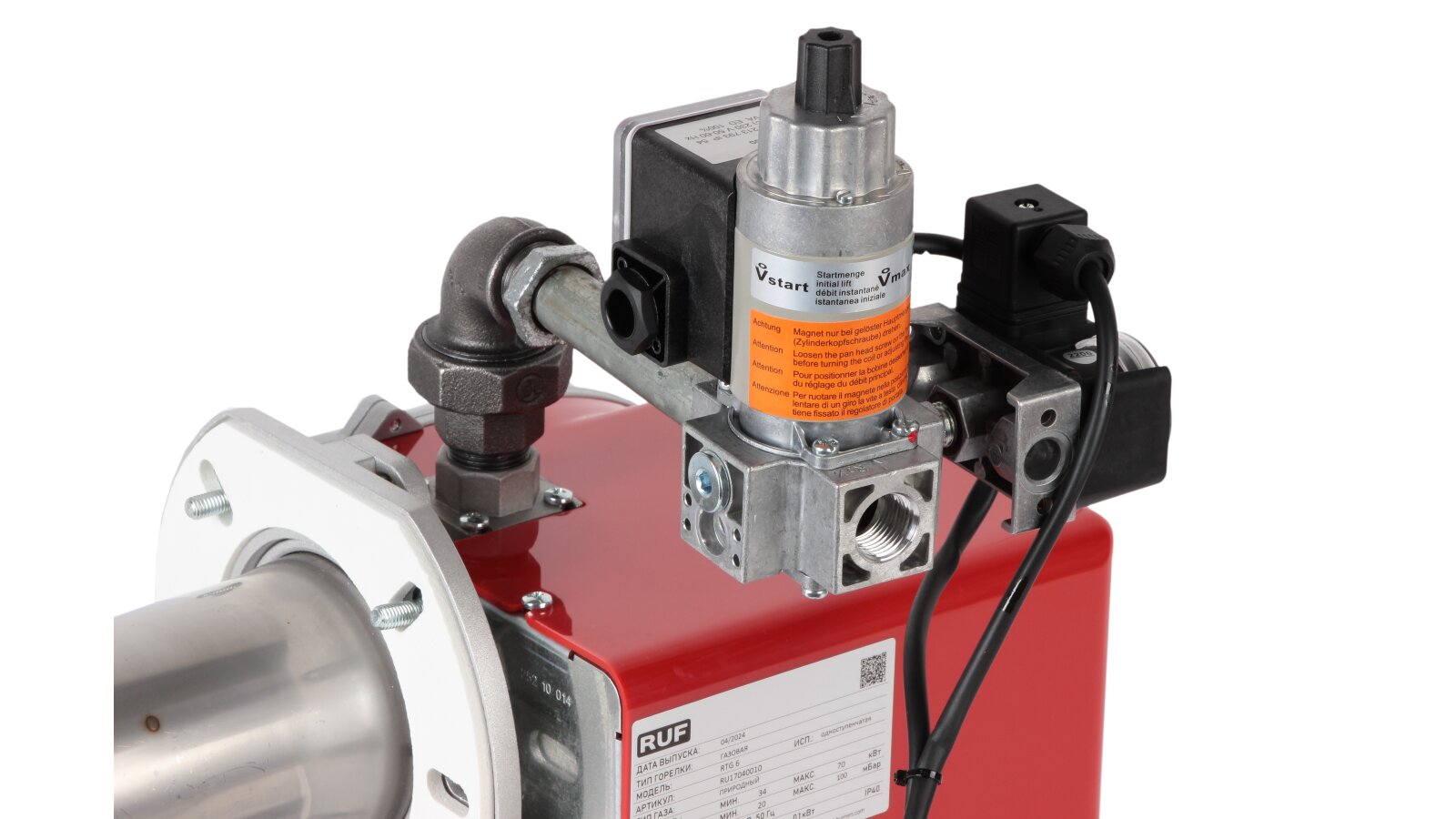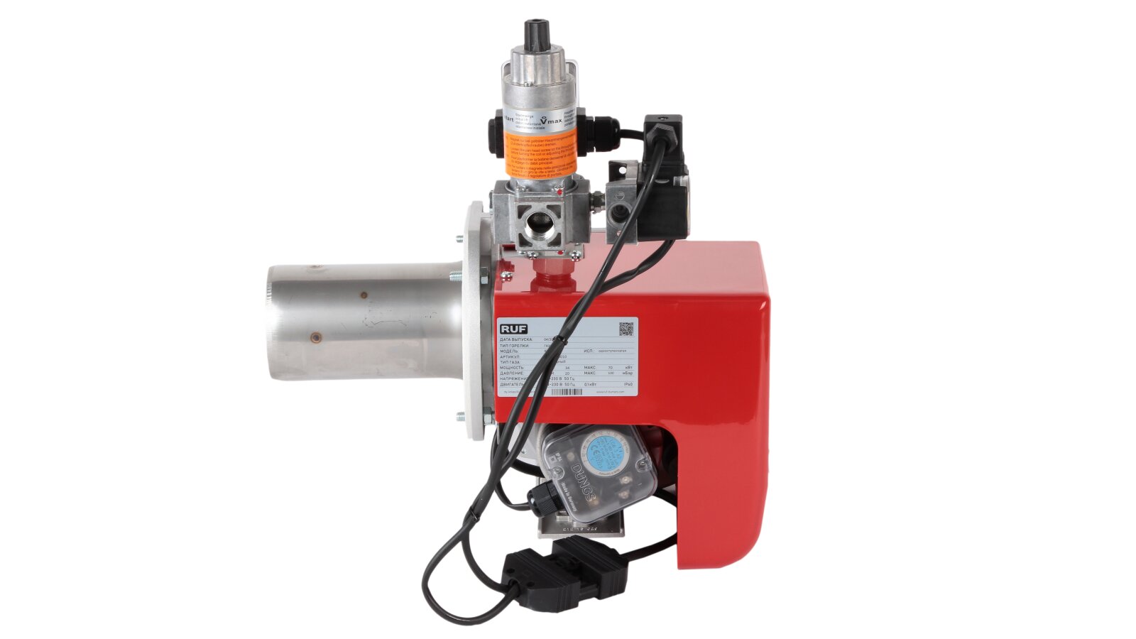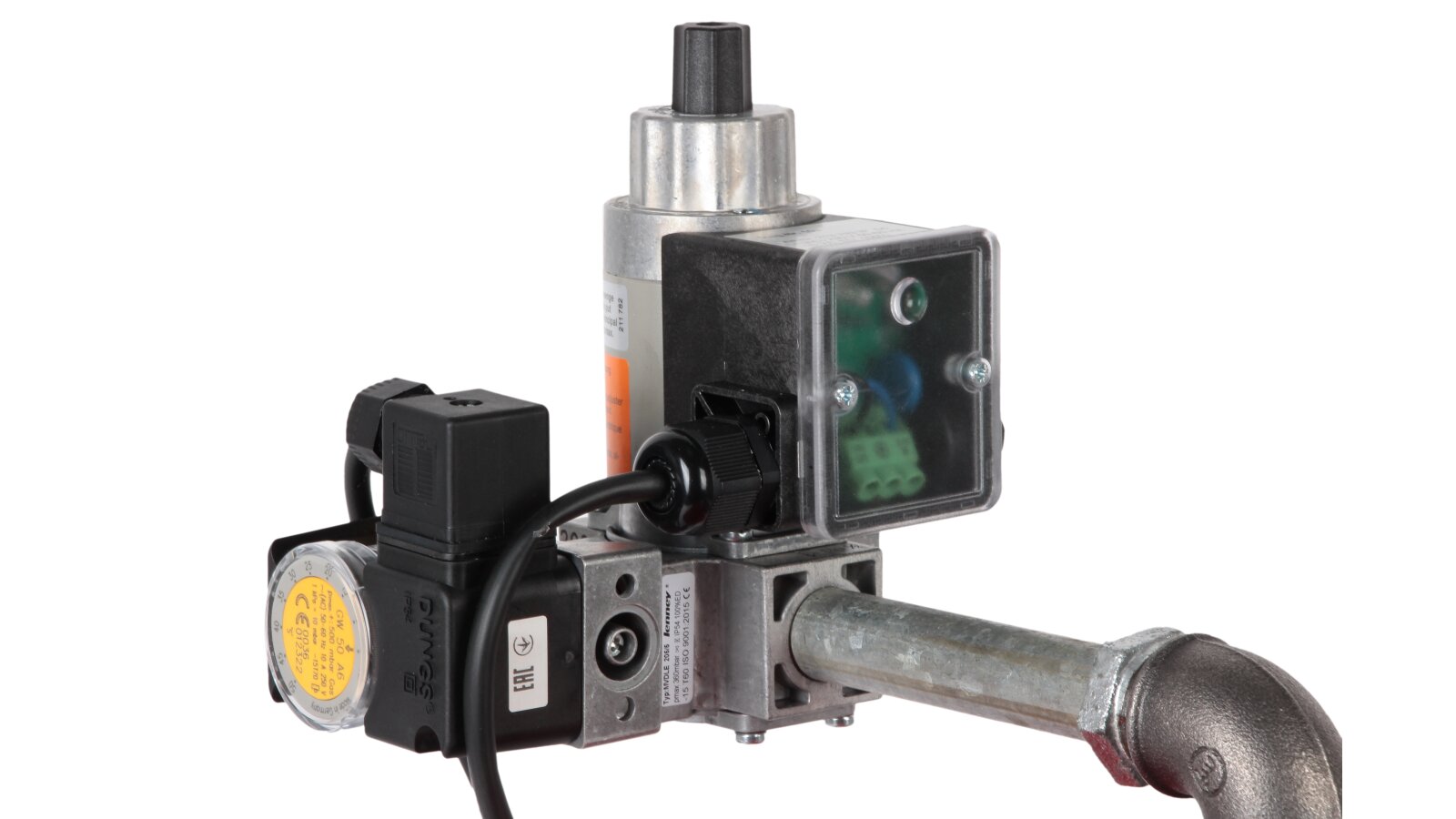 Электропривод имеет регулируемую шкалу, управляет воздушной и газовой дроссельной заслонкой с высокой точностью. В горелке установлены компоненты системы безопасности: реле давления воздуха, электромагнитный клапан, реле давления газа (мин., макс.). В комплект поставки включена газовая рампа, перед которой размещается фильтр и ручной запорный газовый кран.