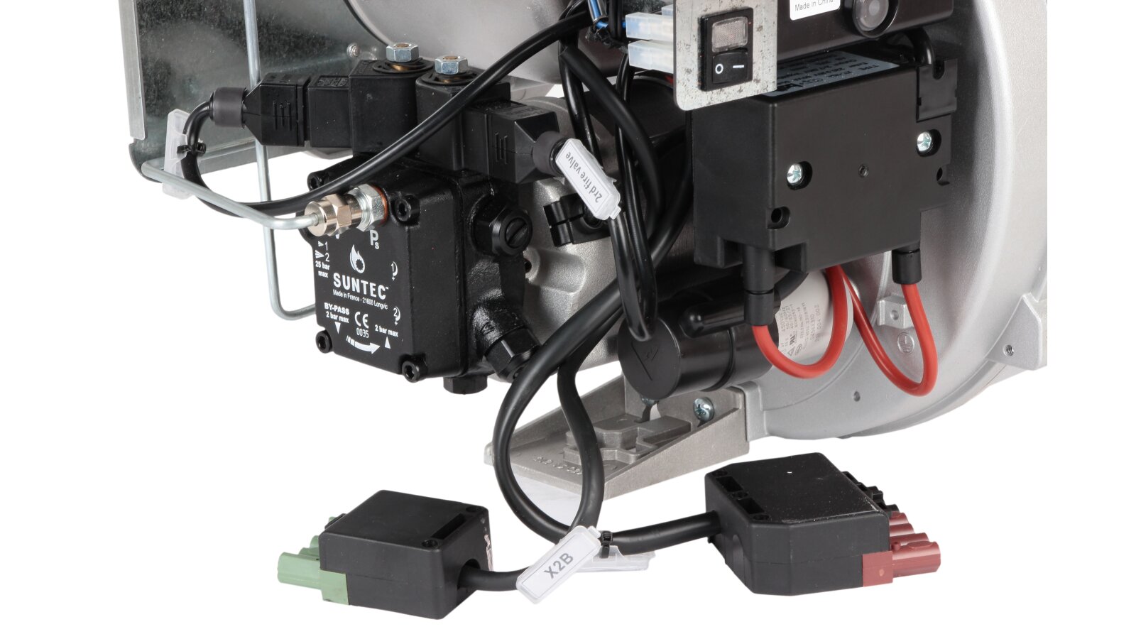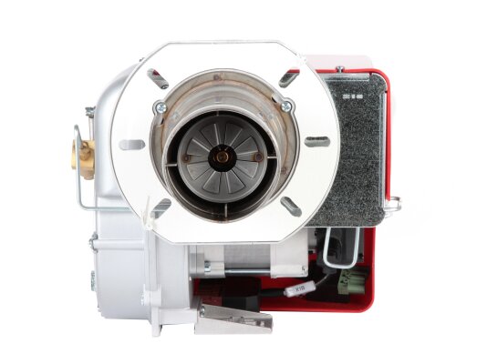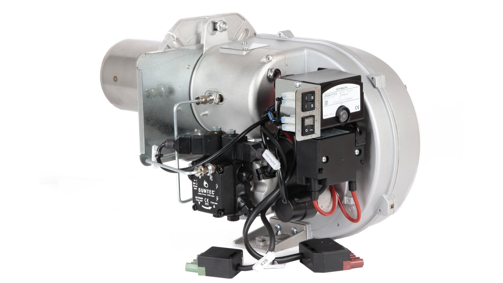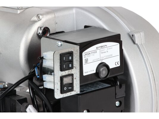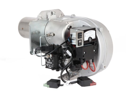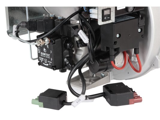 В состав горелки входят: вентилятор, топочный автомат, жидкотопливный насос, двигатель, запальный блок, датчик пламени, воздушная заслонка, электрические компоненты. В линии подачи топлива установлены быстрозакрывающиеся электромагнитные клапаны. Комплектация включает штекер, топливный фильтр, шланги, голову сгорания стандартной длины, форсунку, фланец с прокладкой для крепления. Опция: удлиненная огневая голова.