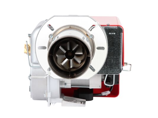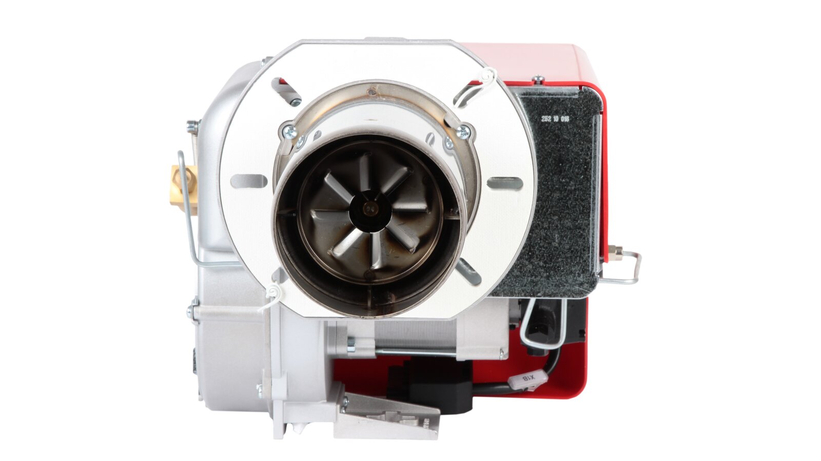 Встроенный вентилятор обеспечивает подачу необходимого объема воздуха на горение. Топливо подается под давлением на форсунку с помощью насоса, смешивается с воздухом в смесительном узле, воспламеняется электродом с образованием ровного, стабильного пламени.