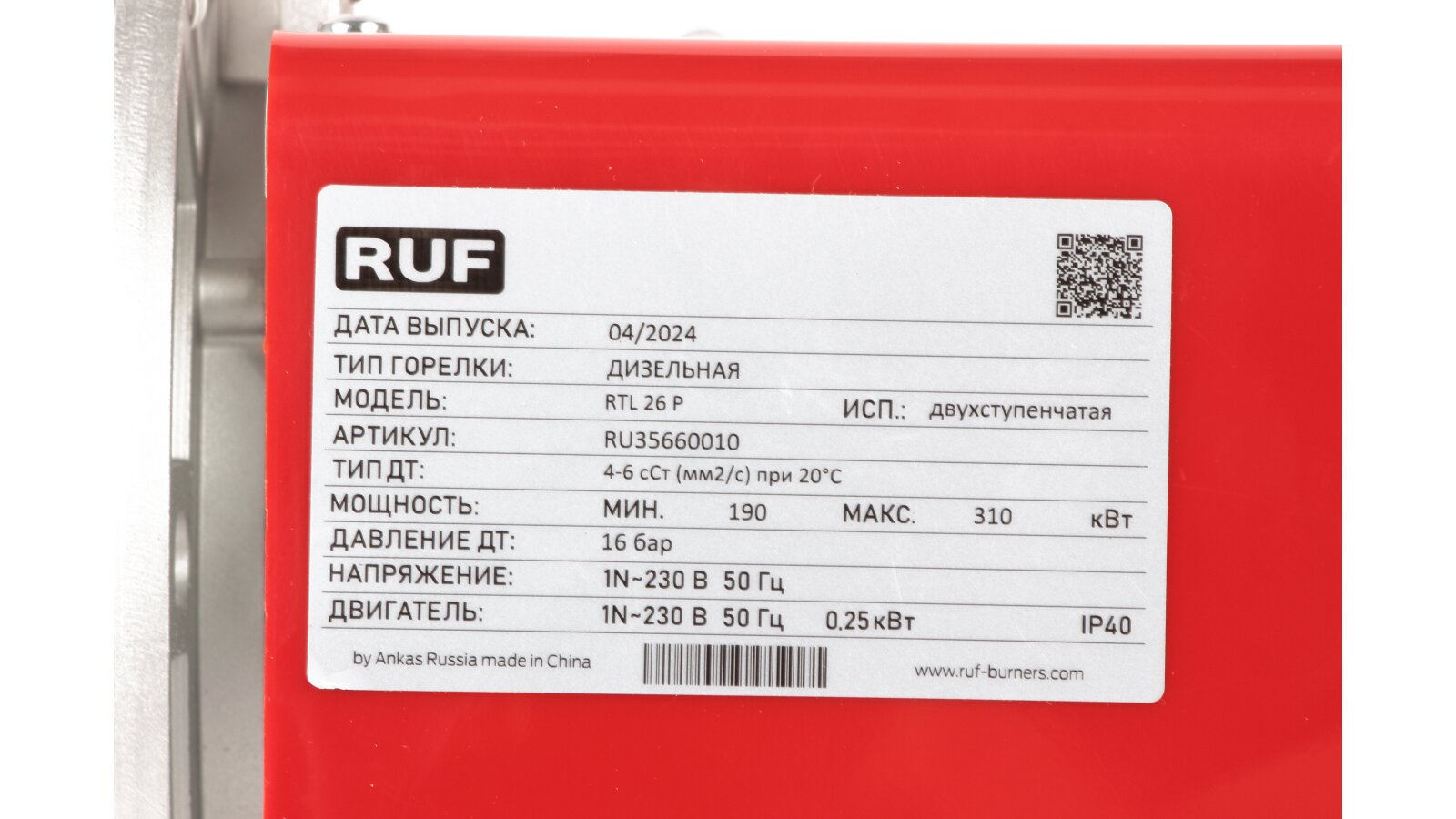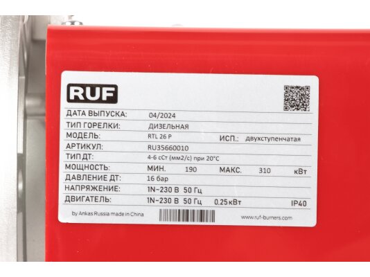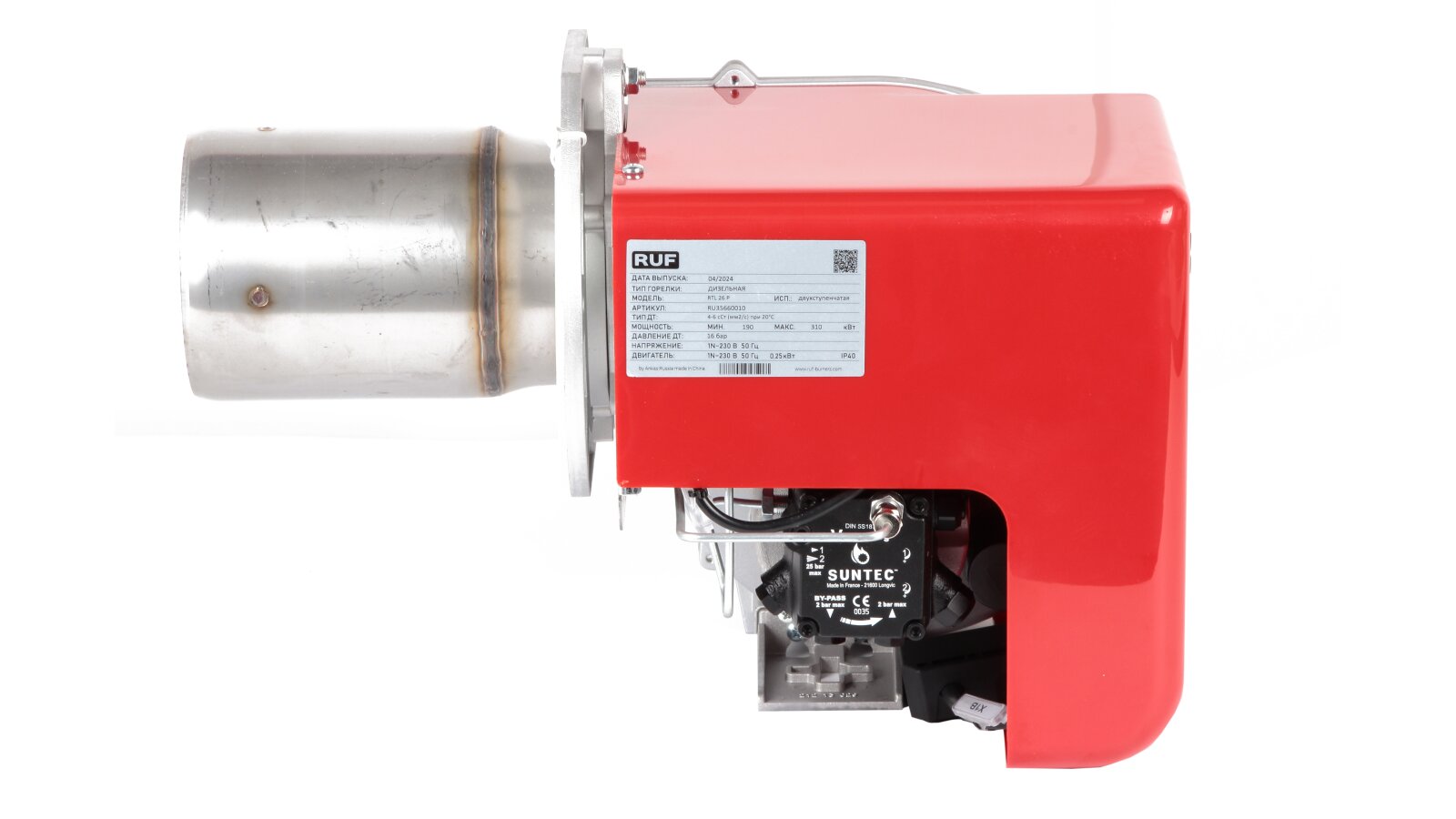 Дизельная горелка RUF RTL 26 P, арт: RU35660010 работает в двухступенчатом режиме регулирования мощности, что позволяет точно настроить тепловую производительность котла. За счет автоматизации функций и комплектующих европейских брендов обеспечивает безопасное горение, стабильное пламя и эффективное сжигание топлива.